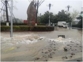 不到10分鐘,應(yīng)急搶修隊(duì)員迅速到達(dá)南湖廣場?,F(xiàn)場發(fā)現(xiàn)有大量泥沙被水沖出,這說明漏水點(diǎn)附近地基可能已被水流淘空。為防止發(fā)生人員安全事故,搶修人員冒著大雨站在現(xiàn)場,提醒過往車輛和行人繞行。經(jīng)現(xiàn)場仔細(xì)勘查,搶修人員迅速制定維修方案,并投入到緊張的搶修工作。
