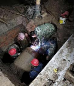 該段水泥管屬于主城區(qū)老舊管網(wǎng),管道周圍環(huán)境復(fù)雜,布有國防光纜、天然氣管道等重要設(shè)施,不能動(dòng)用大型機(jī)械,只能通過人工及簡(jiǎn)易工具開挖。時(shí)間緊,任務(wù)重,為爭(zhēng)取搶修時(shí)間,搶修人員一邊現(xiàn)場(chǎng)制訂維修方案,一邊聯(lián)系準(zhǔn)備各種配件和維修材料。為將對(duì)用戶的影響降至最小范圍,水廠實(shí)行減壓供水,待開挖和搶修材料一切準(zhǔn)備就緒后,搶修人員實(shí)行帶水作業(yè),先給套管預(yù)留一個(gè)DN50鋼管作為導(dǎo)流口,待水泥頭子徹底凝固后再關(guān)閉導(dǎo)流口。封堵水泥頭子時(shí),噴涌而出的水流濕透了搶修人員的衣服,速干水泥灼傷了他們的皮膚,但他們沒有一絲退縮,仍爭(zhēng)分奪秒地在水坑中忙碌著搶修工作。