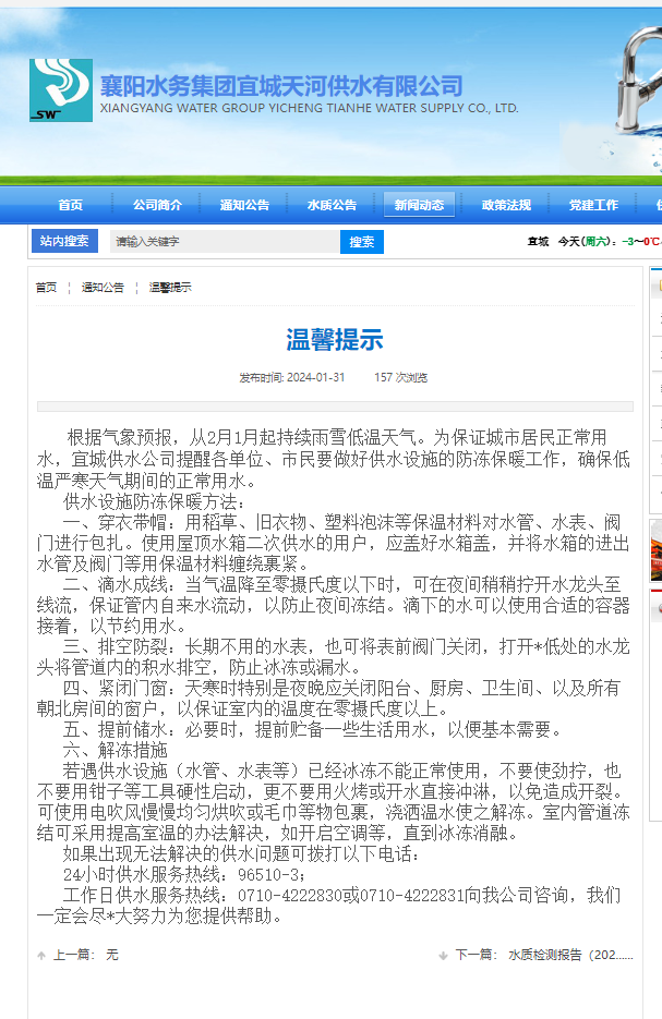 近日,我市出現(xiàn)強(qiáng)降雪天氣,極端低溫天氣易造成供水管網(wǎng)、水表、水龍頭等設(shè)施的凍損,影響市民用水安全。為保障全市供水安全穩(wěn)定,宜城天河供水公司堅(jiān)持提前部署、預(yù)防為主、及時(shí)搶修原則,扎實(shí)做好寒潮及春節(jié)期間保障供水的防御和應(yīng)對(duì)措施準(zhǔn)備。
